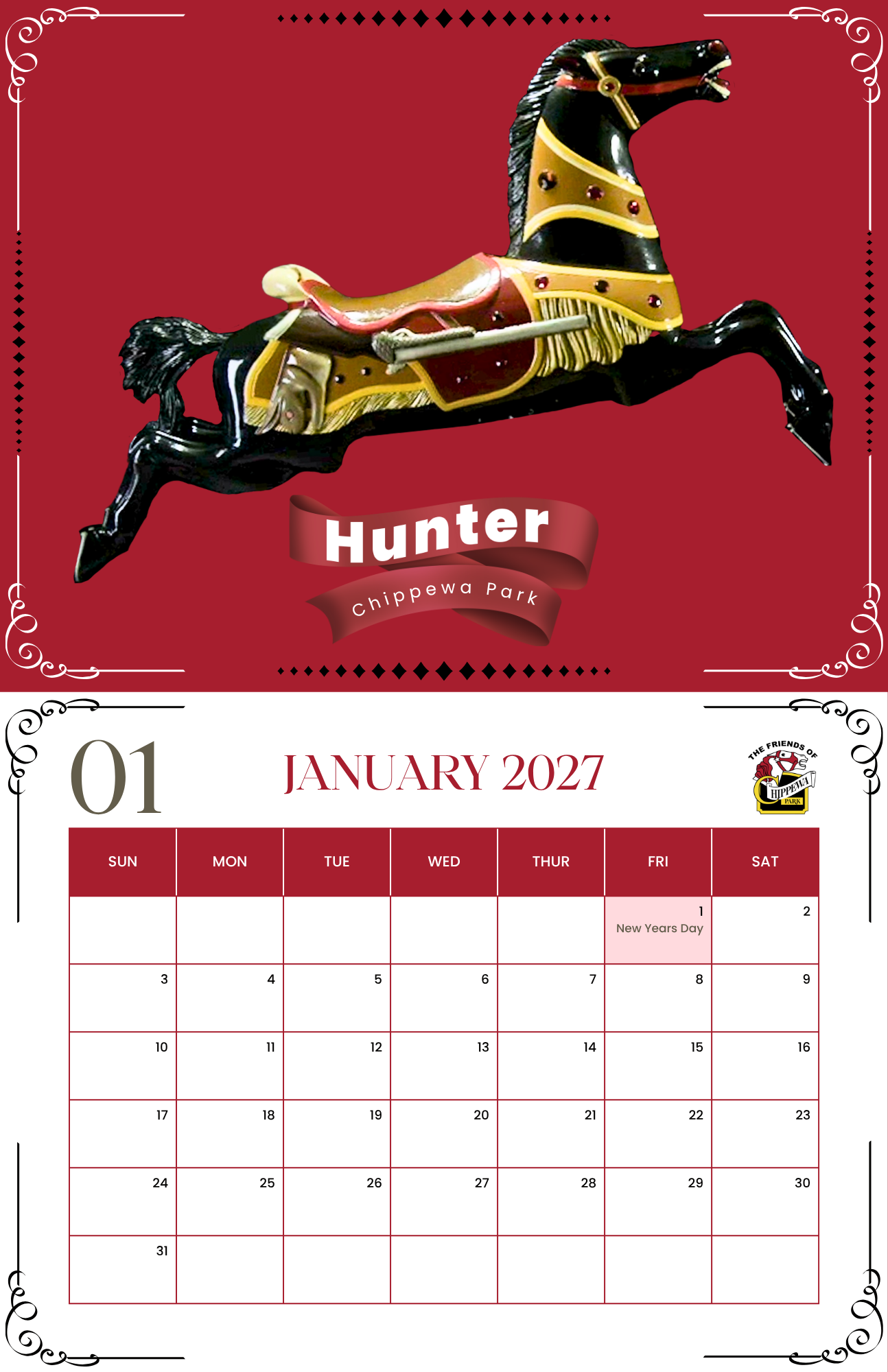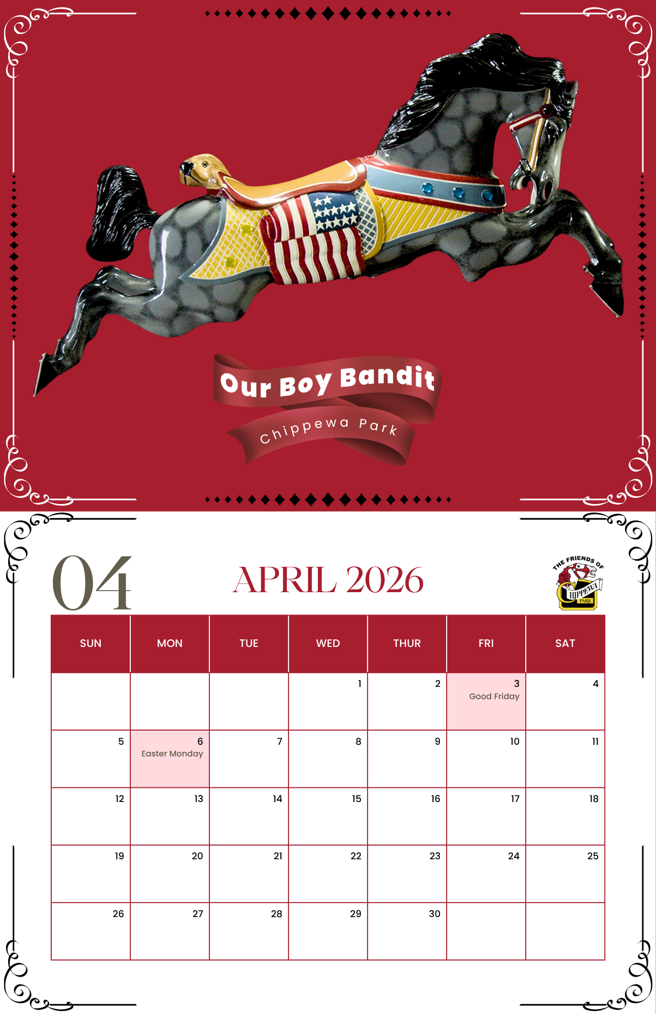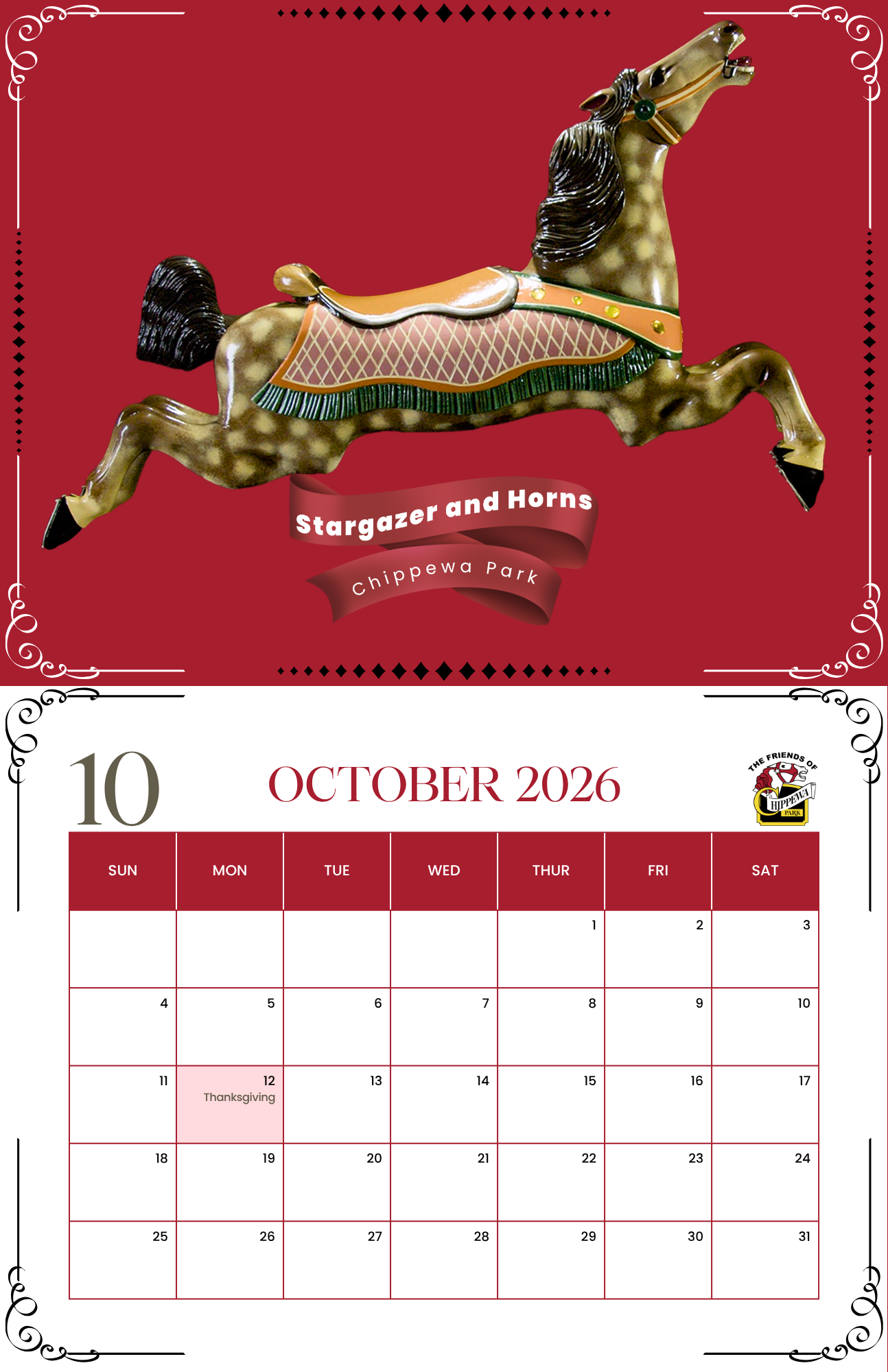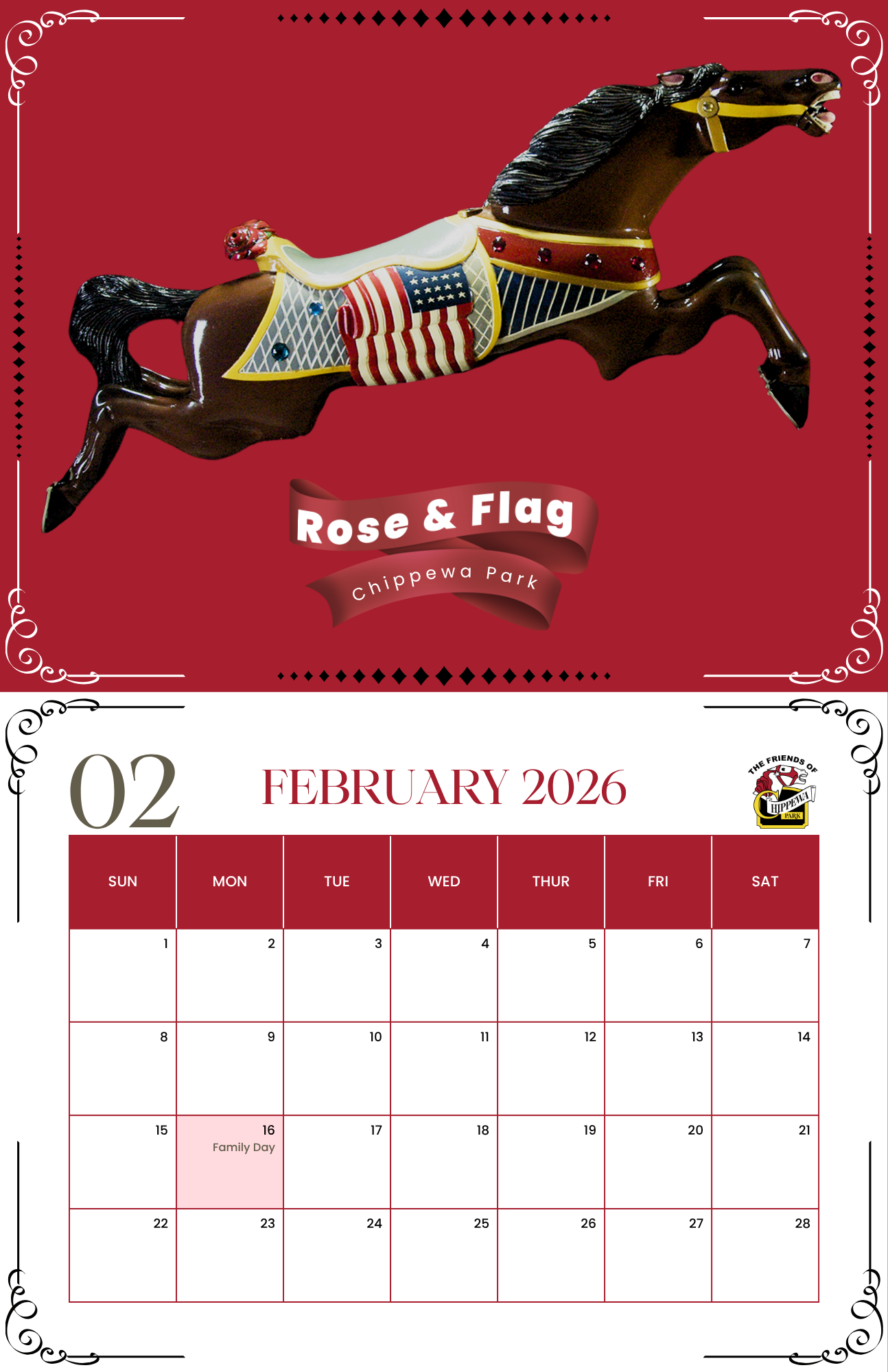 Celebrate the beauty of Chippewa Park with our 2026 Horse Calendar, featuring our carousel horses in stunning detail. Each month showcases the charm and character of these beloved figures. A perfect keepsake for horse lovers and park fans alike!