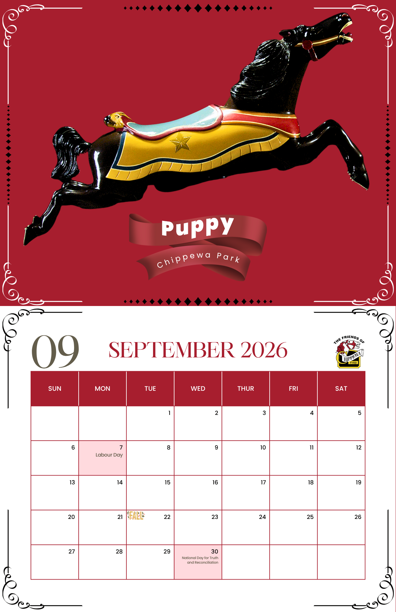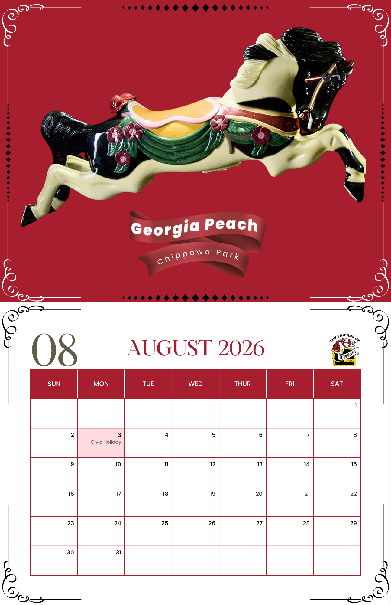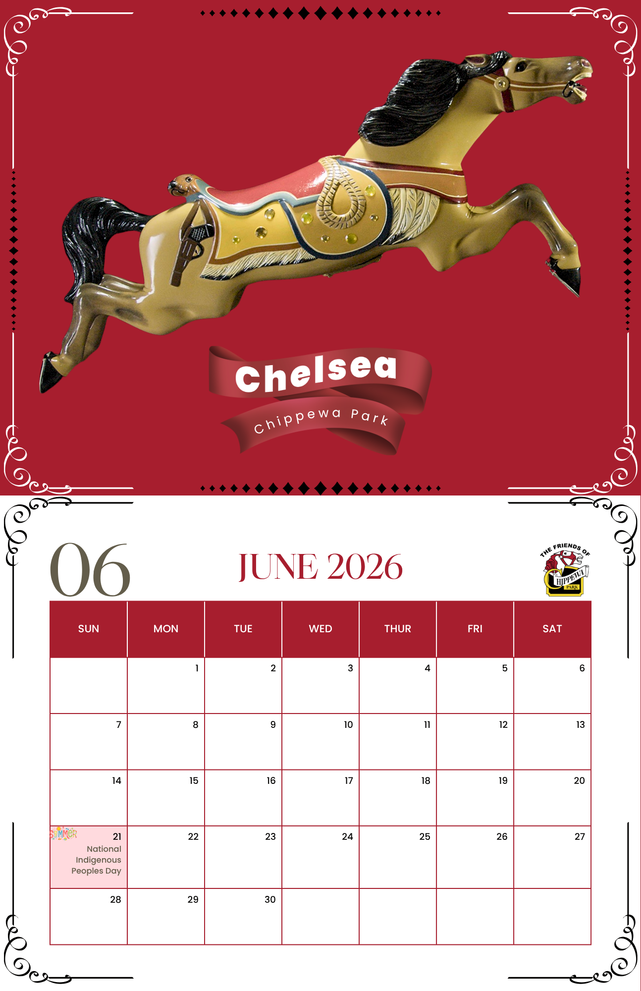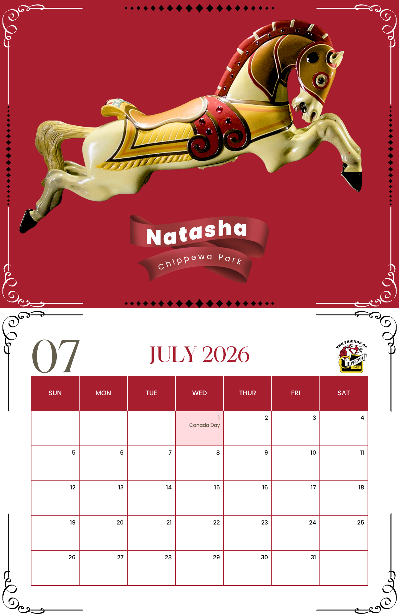 Celebrate the beauty of Chippewa Park with our 2026 Horse Calendar, featuring our carousel horses in stunning detail. Each month showcases the charm and character of these beloved figures. A perfect keepsake for horse lovers and park fans alike!